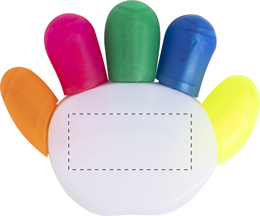 Handförmiger Textmarker aus ABS-Kunststoff mit 5 Markerfarben.